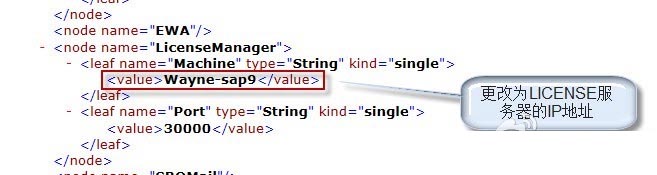 在這兩個文件夾中,都有一個名字叫:b1-local-machine.xml 的文件,用記事本或其它可以編輯XML文件的軟件打開,找到節(jié)點:LicenseManager,把里面的登錄機器名改為你License服務(wù)器的IP地址,然后保存即可,如下圖所示: