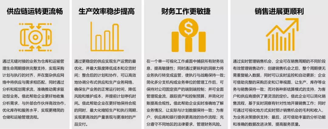 與其他行業相比,高科技企業更需要提高業務敏捷性,快速響應全球供應網絡,以此滿足日益苛刻的客戶需求并降低庫存和組件成本;同時他們同樣需要設法降低制造成本,提高響應能力和靈活性;通過更好的業務洞察力保持健康的財務狀況,為業務決策提供依據;同時,他們還需要在所有渠道上創建有針對性的銷售動作,實現銷售和渠道工作的自動化,以更靈活的定價和計費模式滿足客戶個性化的體驗與服務。